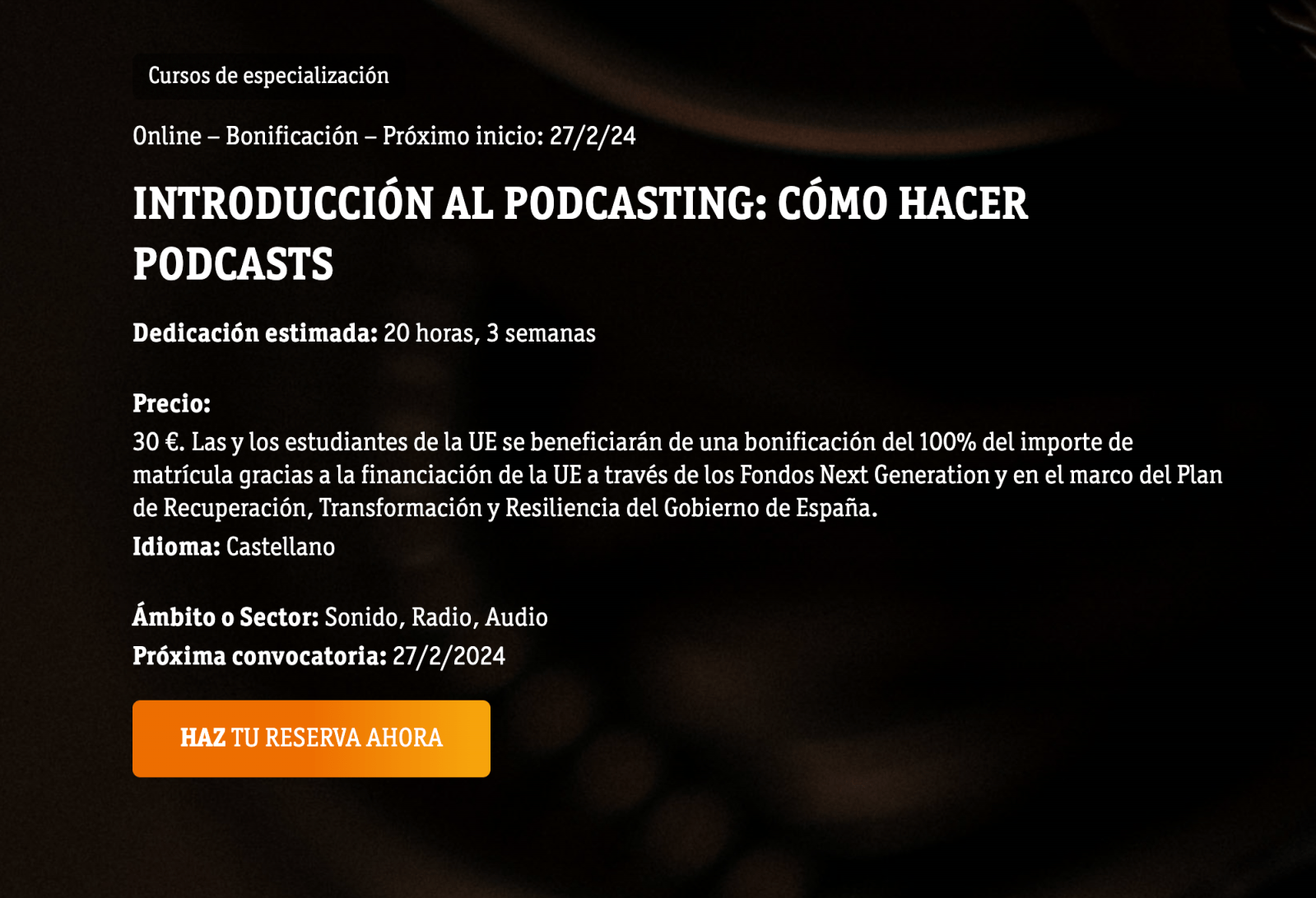 Diseño del curso: «Introducción al podcasting. Cómo crear podcast» de la plataforma de formación de RTVE Instituto.