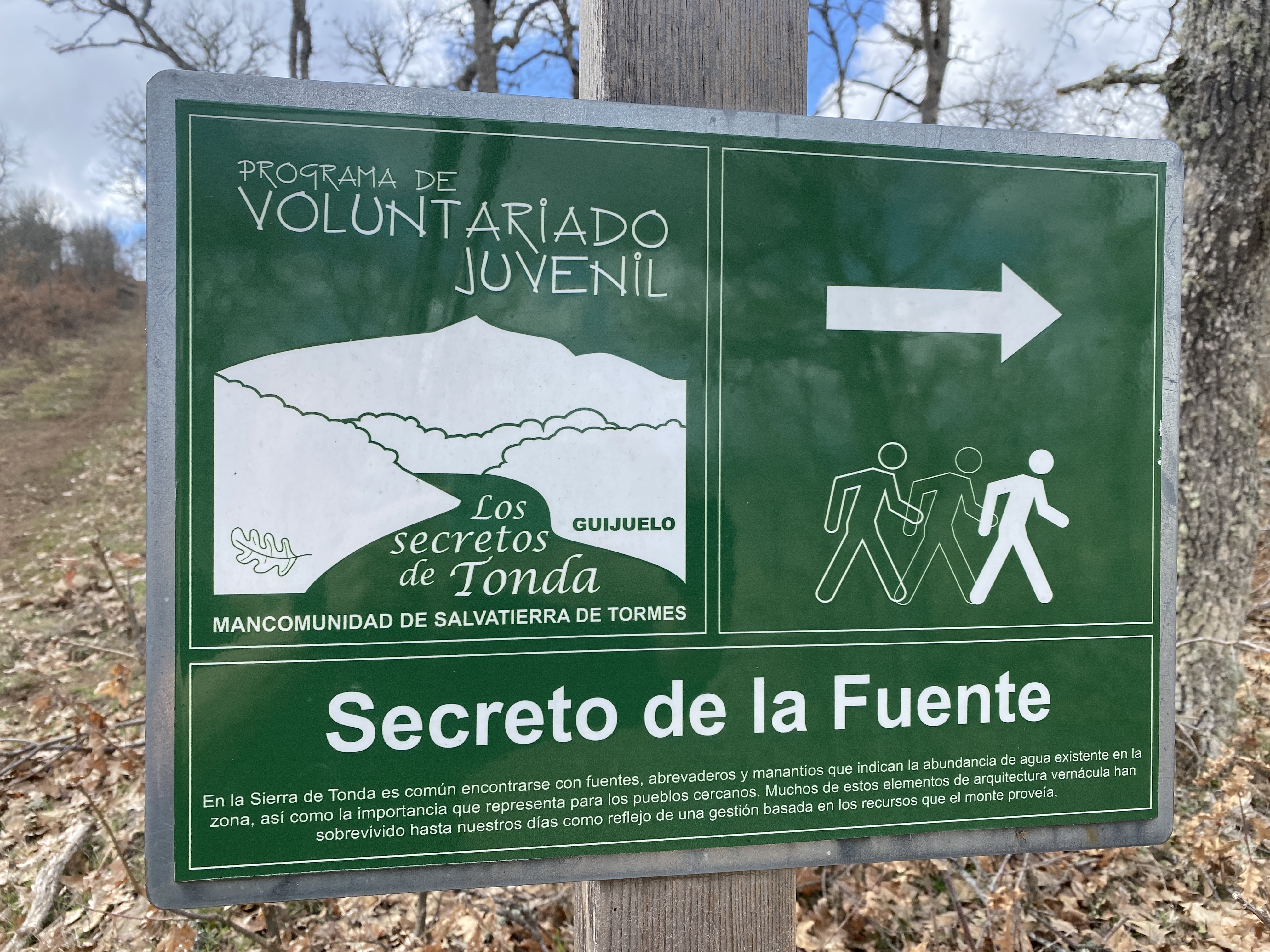 A lo largo de la ruta veremos abrevaderos, charcas y fuentes. Las pocas lluvias de este año las mantienen con poca agua y, en algunos casos, ninguna. Llegamos al “Secreto de la Fuente”, una construcción realizada en granito del terreno y que está rodeada de asientos a ambos lados, incluso de mesas con bancos corridos para meriendas ocasionales.