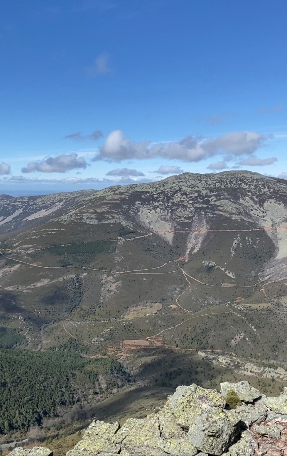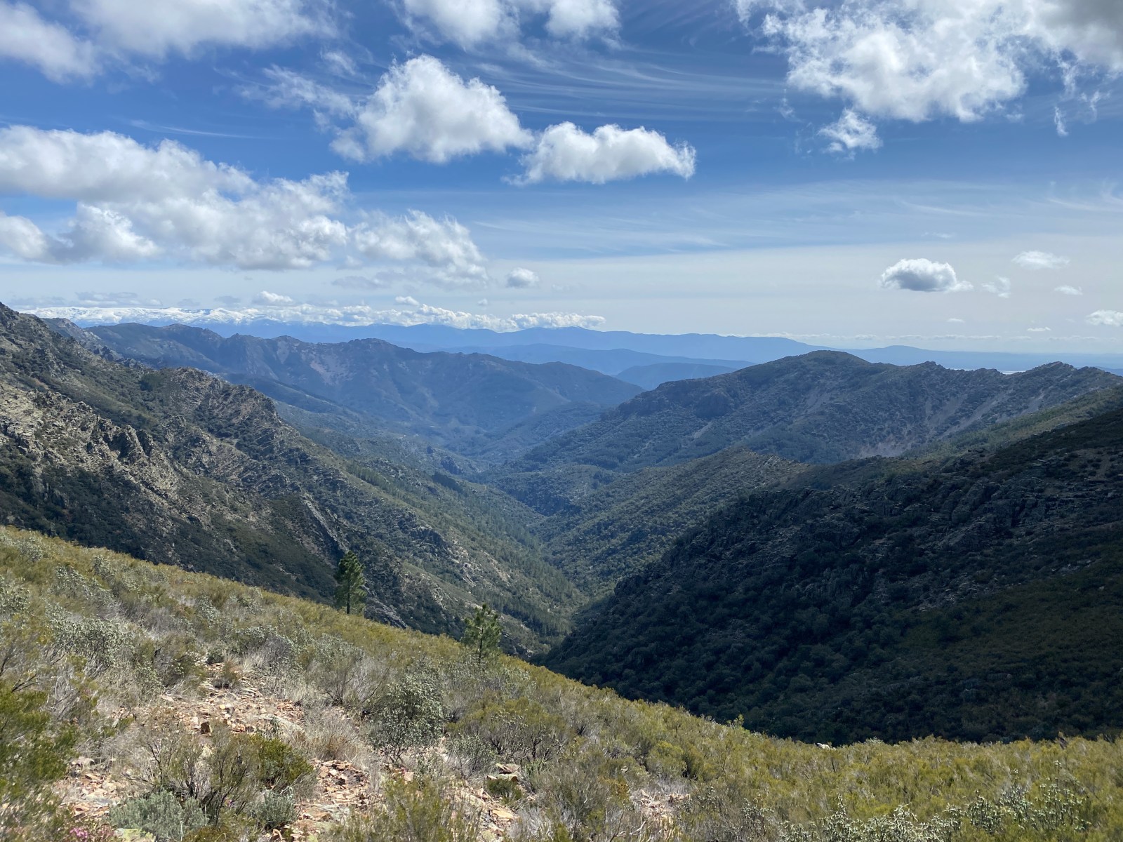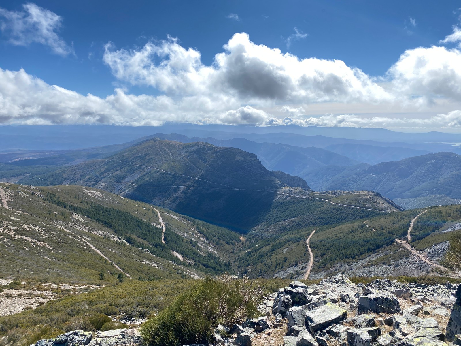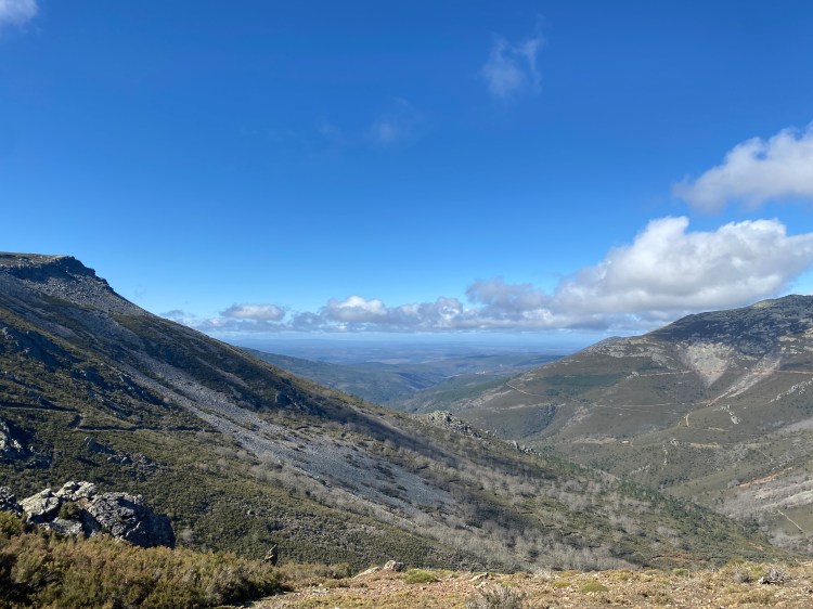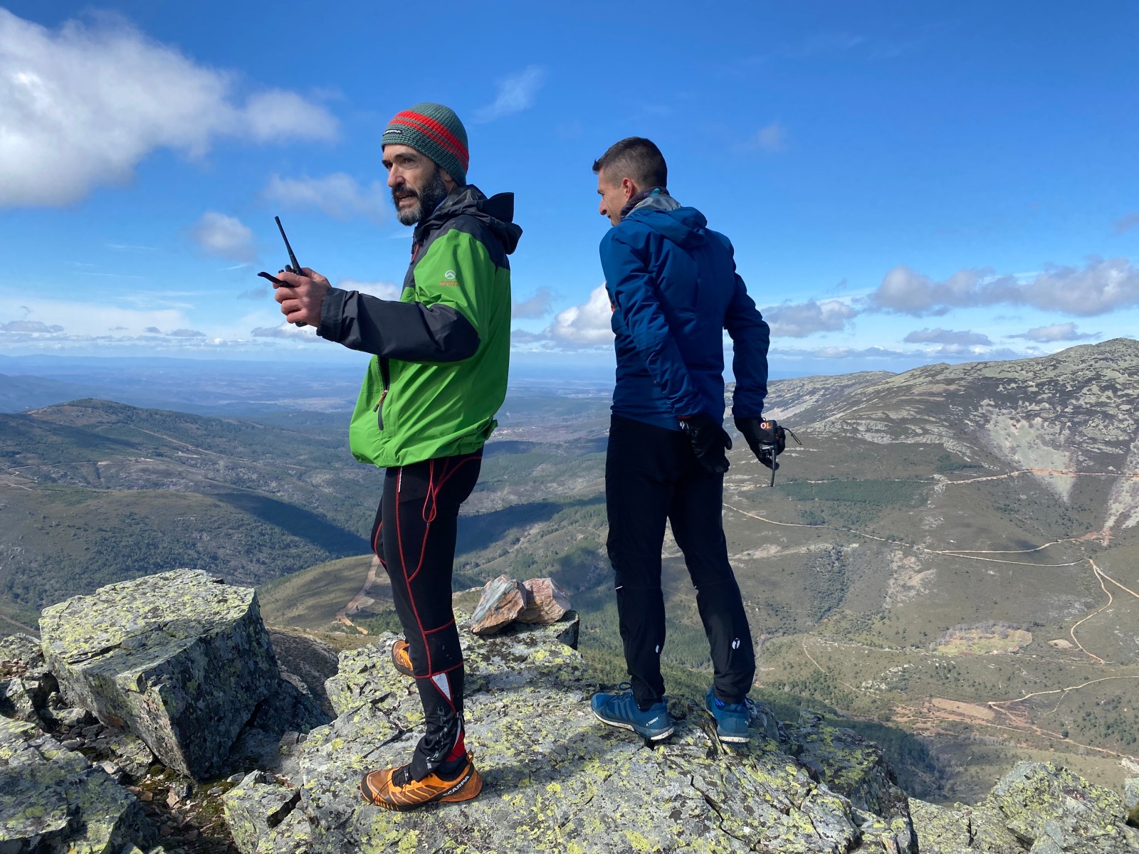 Iniciamos el camino en el Mirador Paso de los Lobos, en la carretera de ascenso a la Peña de Francia, donde coincidimos con gente de la organización de la carrera. Emprendimos la ruta cuesta arriba sorteando como pudimos los riachuelos formados tras la lluvia. Tierra y piedras que a veces obligaban a no perder de vista el suelo, algo complicado porque el paisaje que tienes delante de tus ojos es un espectáculo. La Sierra de Francia y la de Béjar, al fondo; el Valle de las Batuecas bajo tus pies, el embalse de Gabriel y Galán a lo lejos. No podemos pedir más.