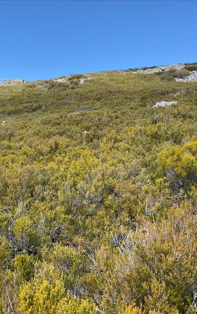 Abandonamos la Mesa del Francés rumbo al Puerto de Monsagro. Toca descender entre brezos y matojos espesos y conviene hacerlo con cuidado porque el terreno es pedregoso y, además, está empapado.