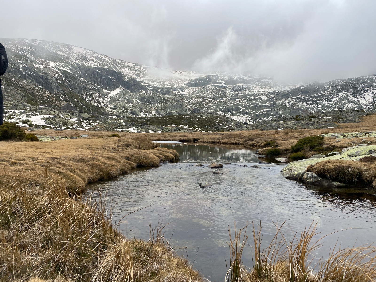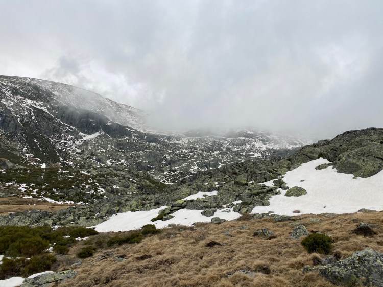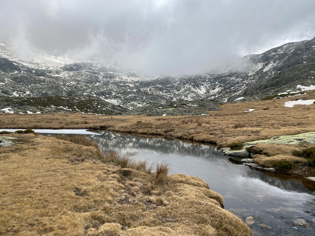 Abandonamos la improvisación para retomar el camino trazado. Un sendero marcado por hitos, como toda la ruta, que nos va llevando poco a poco hasta el encuentro con el río Cuerpo de Hombre. No luce el sol, incluso la niebla hace acto de presencia a medida que vamos tomando altura. Conviene parar de vez en cuando, no solo para tomar aire, sino para contemplar la Sierra de Béjar con unas vistas espectaculares. De fondo, el ruido de las aguas que bajan con fuerza nos hace pensar que estamos cada vez más cerca de nuestro objetivo. Apenas podemos levantar los ojos del suelo porque está prácticamente inundado de agua y son pocos los tramos secos.