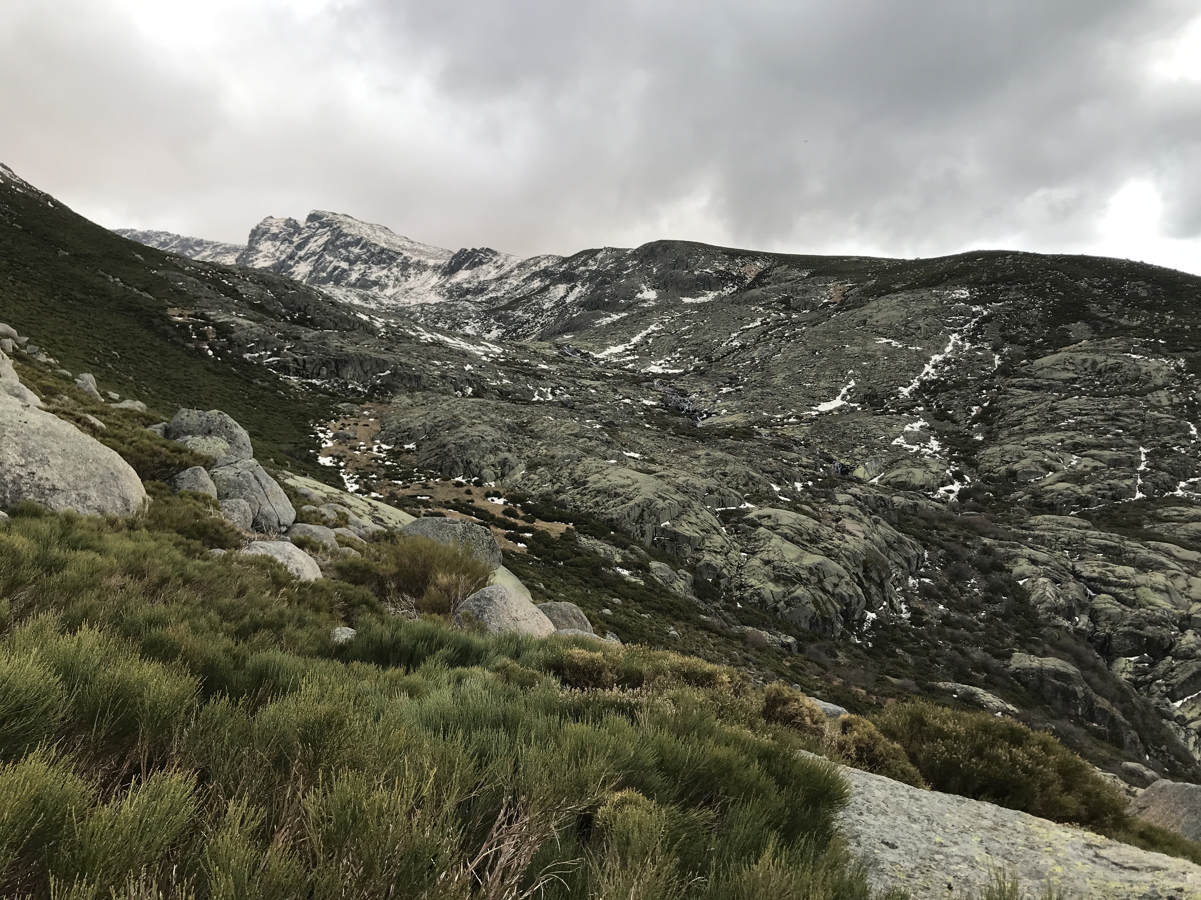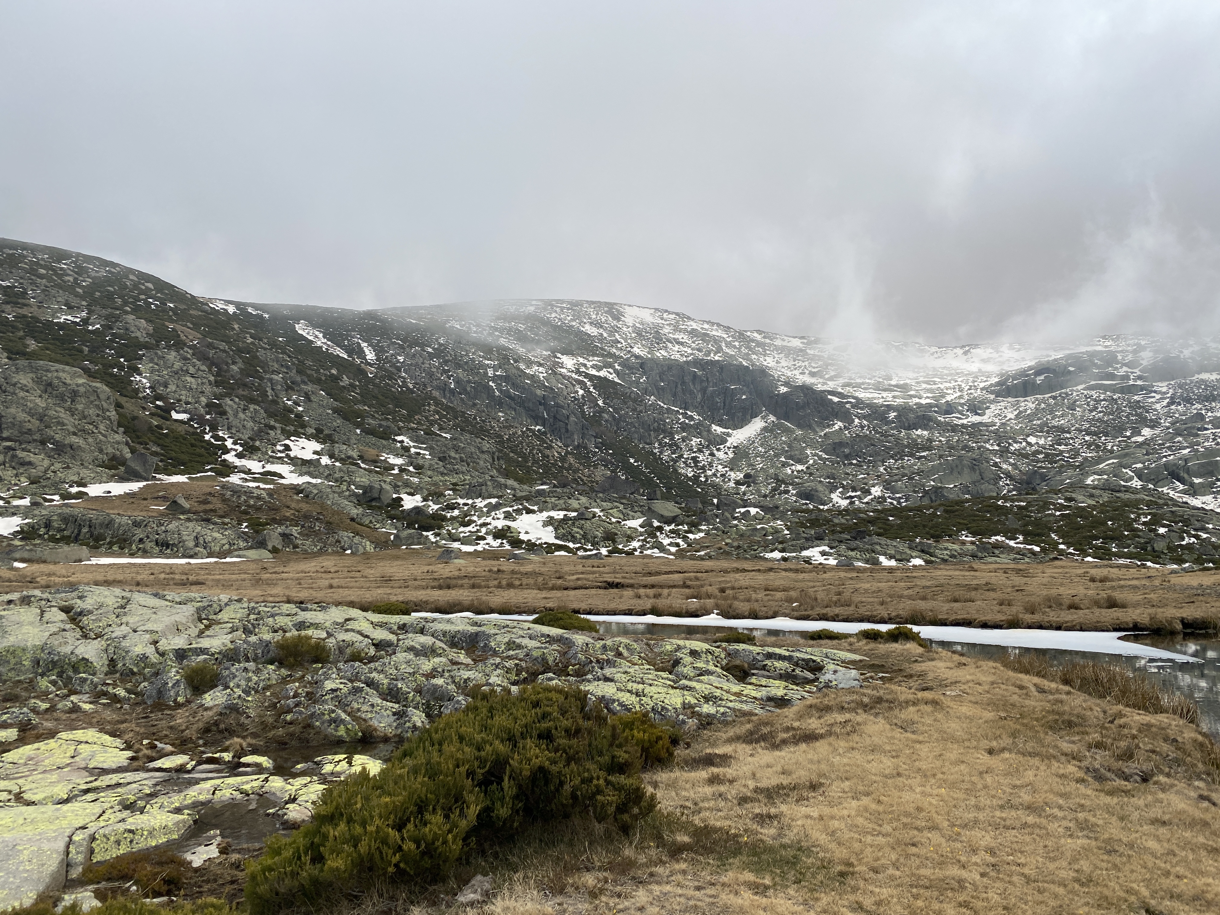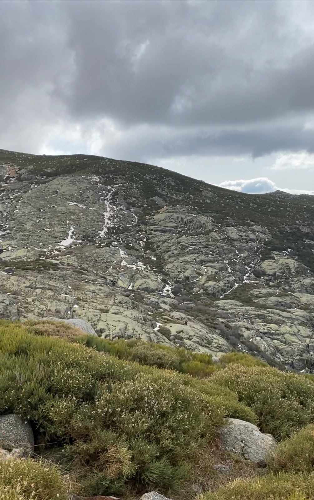 Encontramos algunos tramos con nieve de los últimos días y el terrenos estaba, además, bastante encharcado por las lluvias recientes. Aunque, como dije antes, hay desviaciones indicadas con hitos, nosotros decidimos atrochar por una ladera sin senda marcada entre piornales y retamas. Una subida de tan solo 100 metros que se nos hicieron eternos y solo por ahorrarnos un kilómetro .