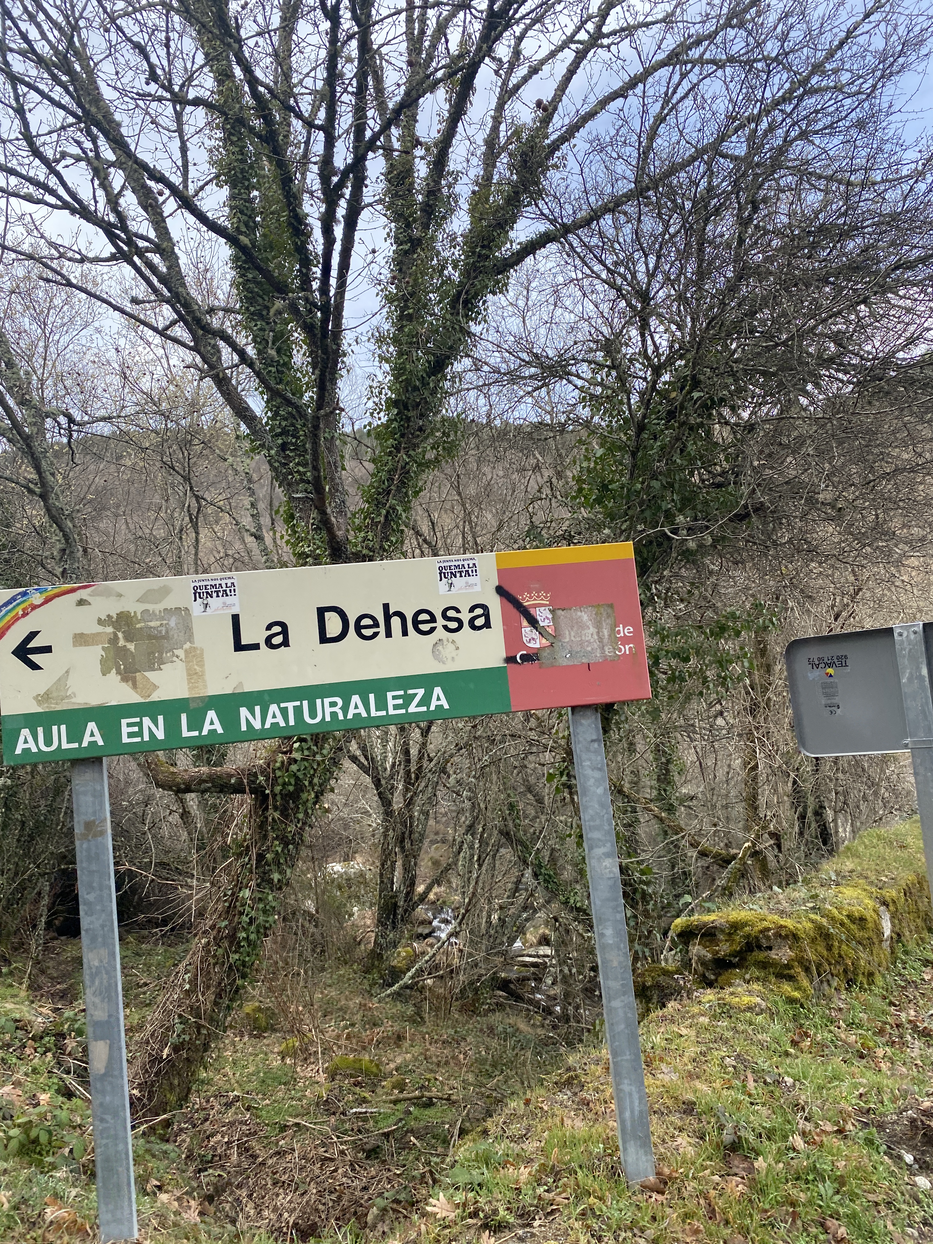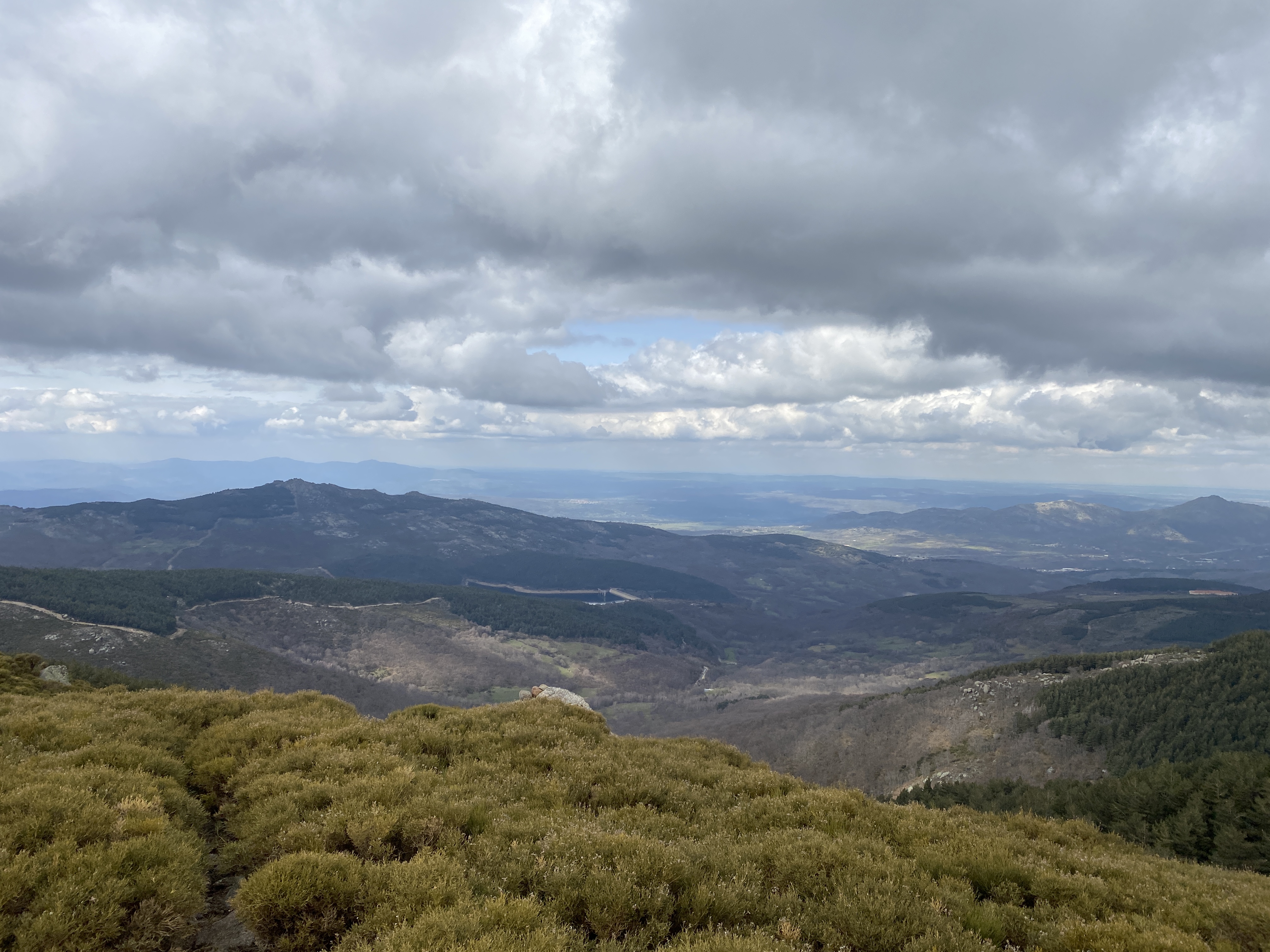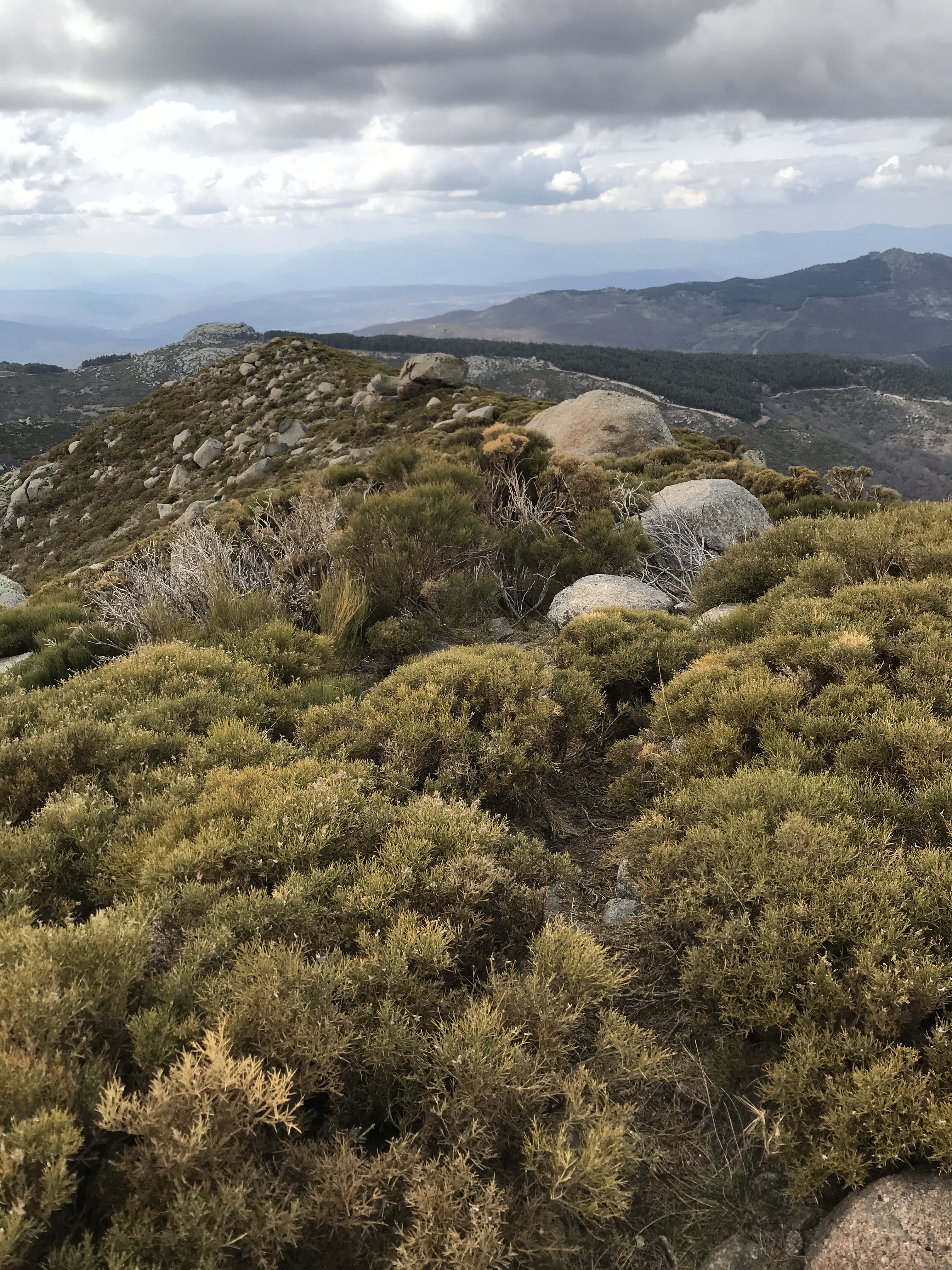 Encontramos algunos tramos con nieve de los últimos días y el terrenos estaba, además, bastante encharcado por las lluvias recientes. Aunque, como dije antes, hay desviaciones indicadas con hitos, nosotros decidimos atrochar por una ladera sin senda marcada entre piornales y retamas. Una subida de tan solo 100 metros que se nos hicieron eternos y solo por ahorrarnos un kilómetro .