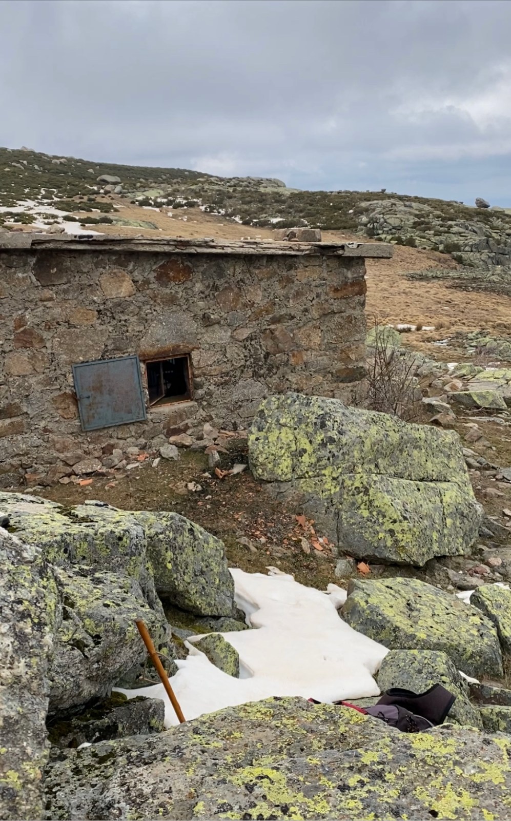 Decidimos no subir hasta el nacimiento del río y quedarnos a comer en el Refugio de Hoya Cuevas, unos metros más arriba. Y así es, lo que ocurre es que el estado del refugio es bastante lamentable y no invita precisamente a comer dentro. La solución la encontramos justo al lado, en unas grandes planchas de granito que utilizamos a modo de mesa. Nos abrigamos bien y comemos.