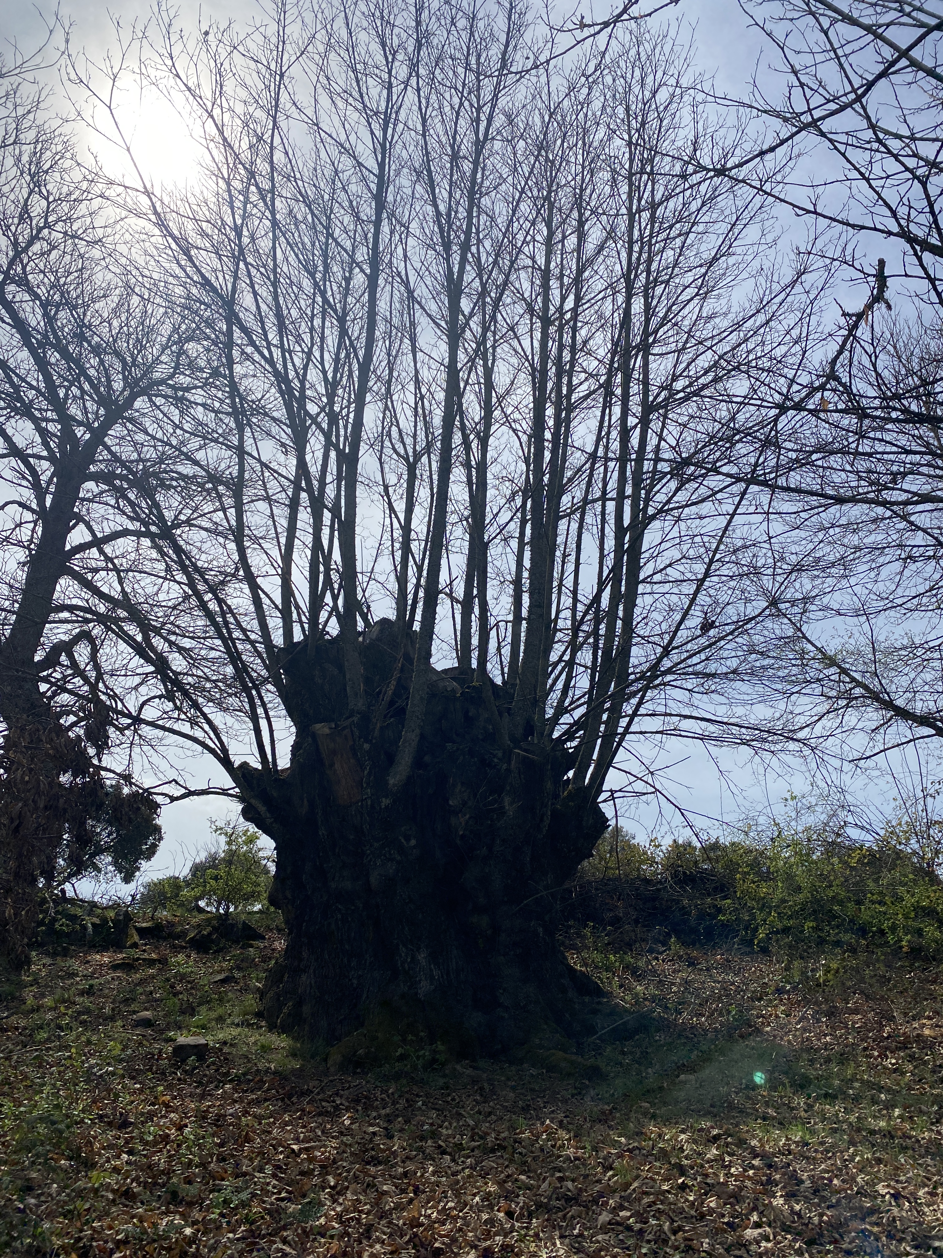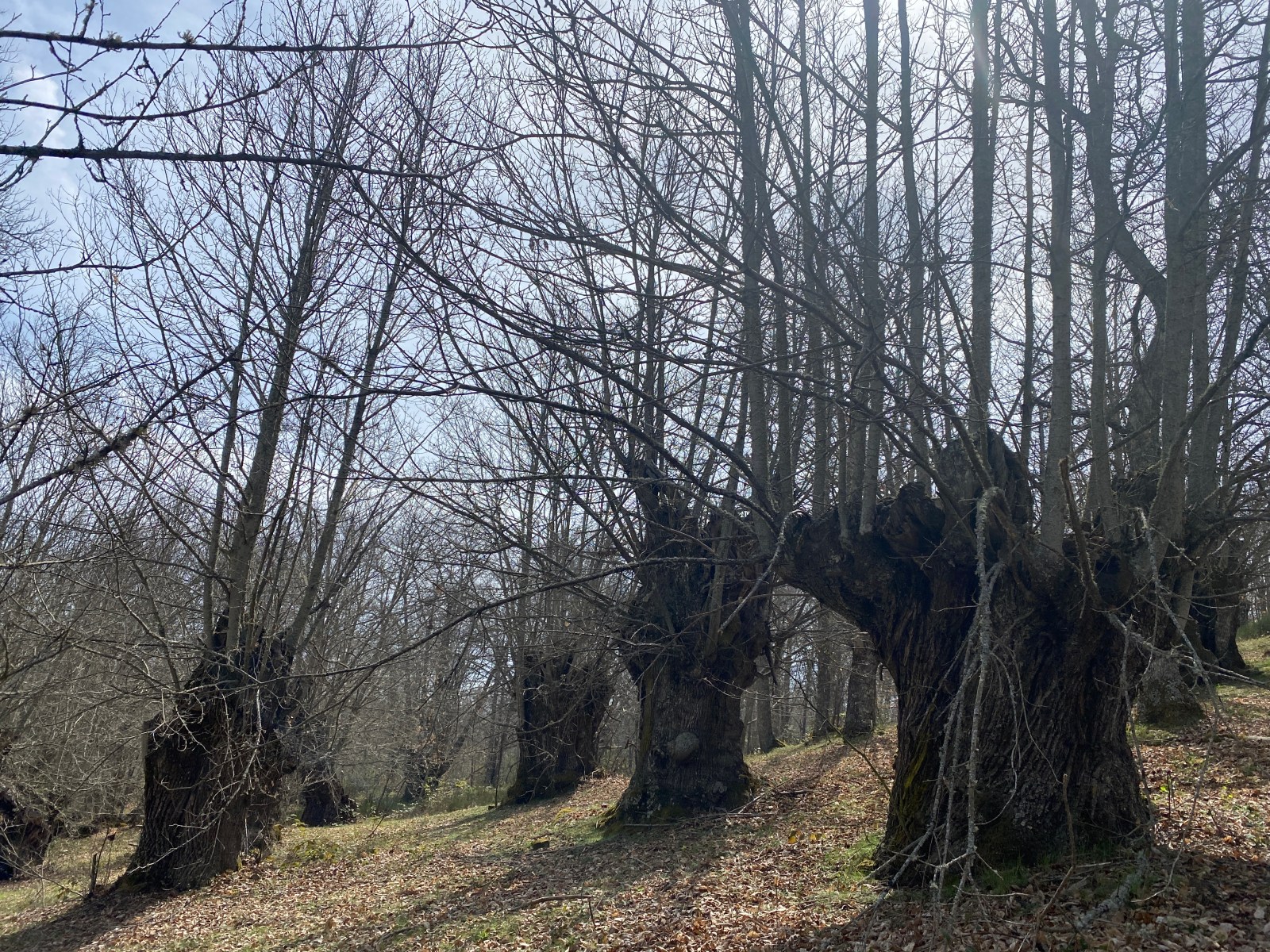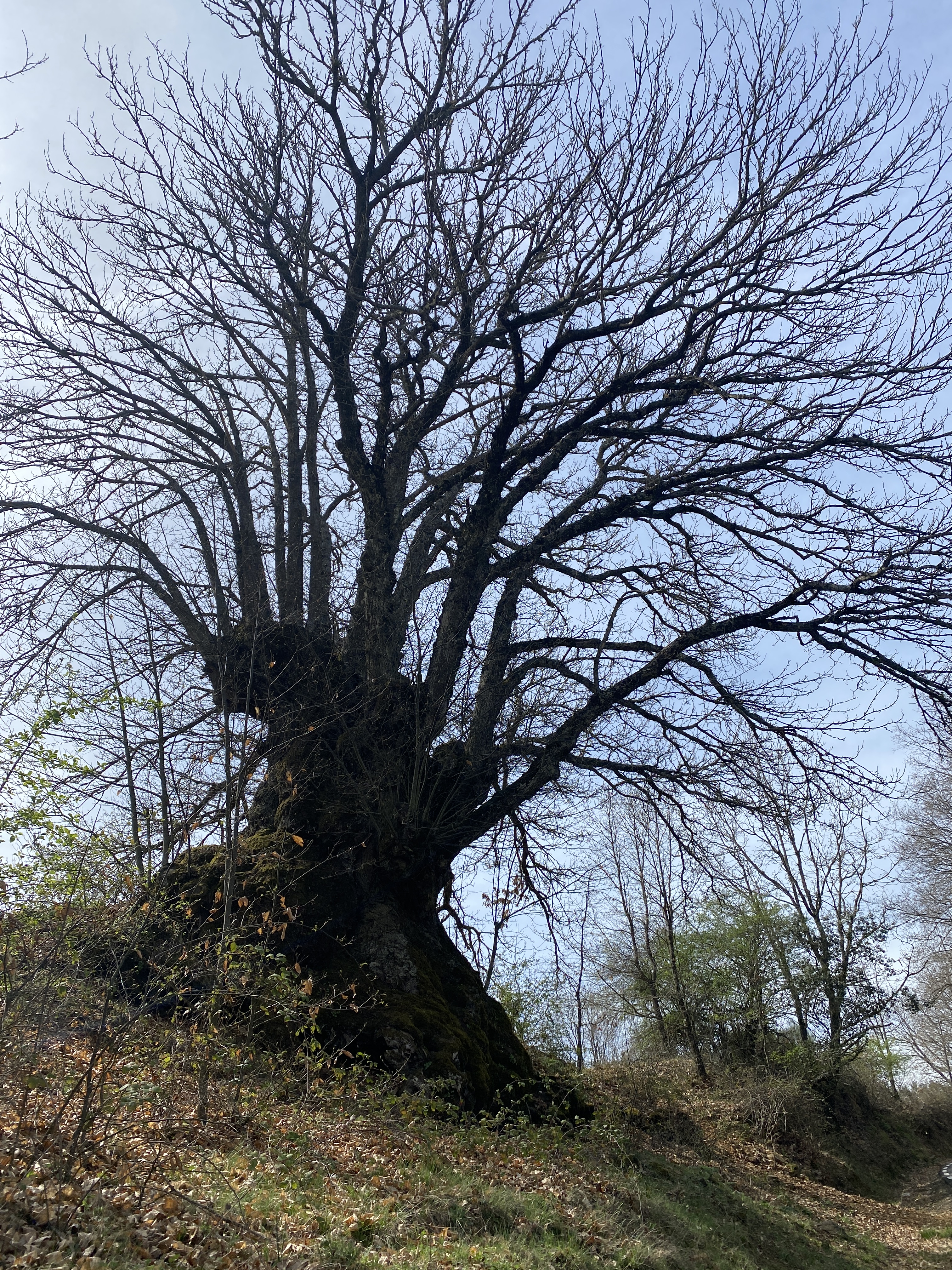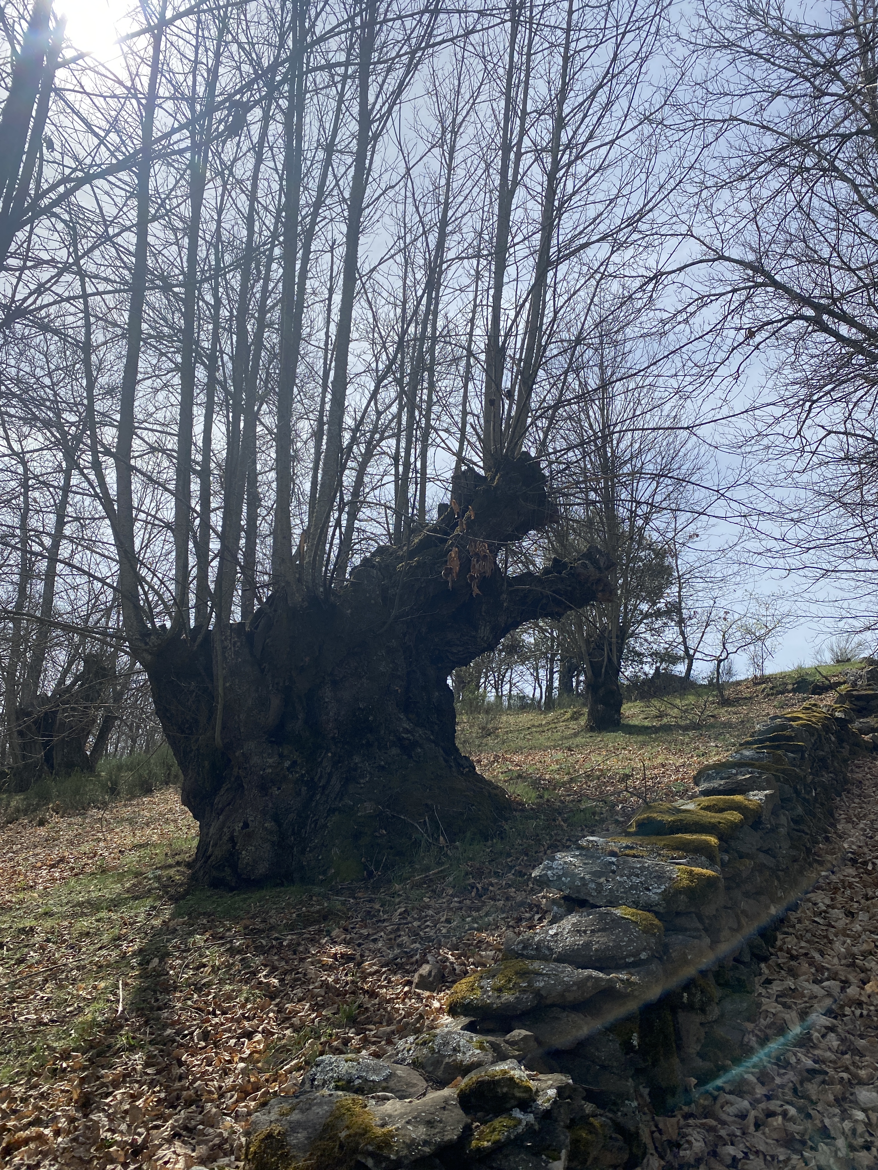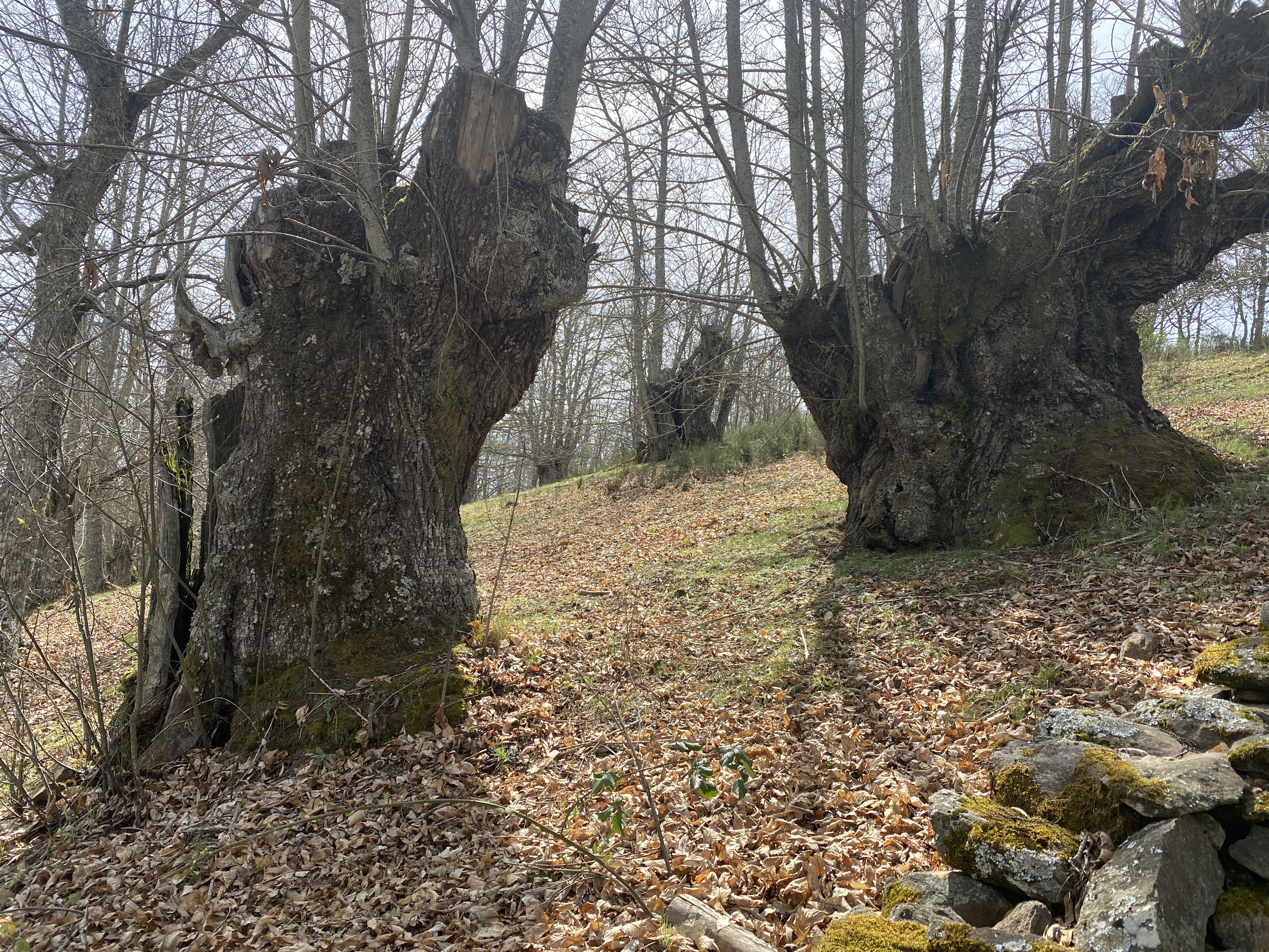 Estamos a principios de la primavera y no se perciben brotes verdes en ninguna de sus ramas y el suelo todavía es una alfombra de hojas secas. Por eso os decía que este bosque hay que verlo en pleno otoño, el espectáculo está garantizado. Además de tener una gran envergadura, algunos están huecos por dentro, incluso permiten que te metas en ellos para contemplar su inmensidad. Ahora, como vayas con la intención de abrazar alguno, misión imposible. Tendrás que conformarte con algún que otro roble flaco que vemos junto a los castaños.