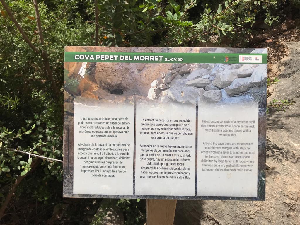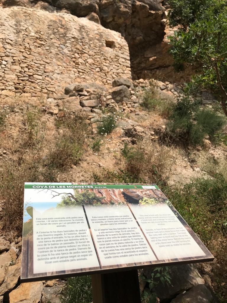 Llama la atención las constantes cuevas que nos encontramos en el camino. La Cova de los Morretes, la Cova del Ti Domingo l’Abiar, la Cova de Pepet el Morret, y la Cova del Morro del Bou. Unas cavidades excavadas en la roca a base de piedra seca y mortero que sirvieron de cobijo a pescadores y agricultores, incluidos los animales de carga o los contrabandistas que aguardaban la llegada de telas o tabaco . Las cuevas tenían distintas estructuras como hornos para hacer pan, la vivienda y un pesebre para los animales.