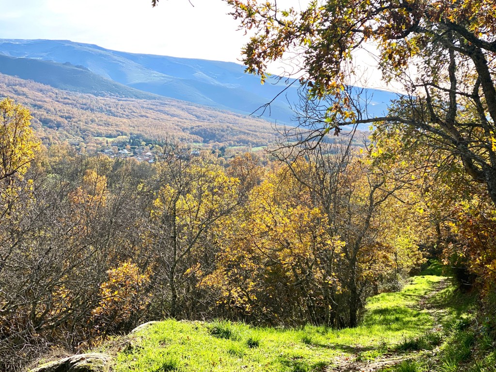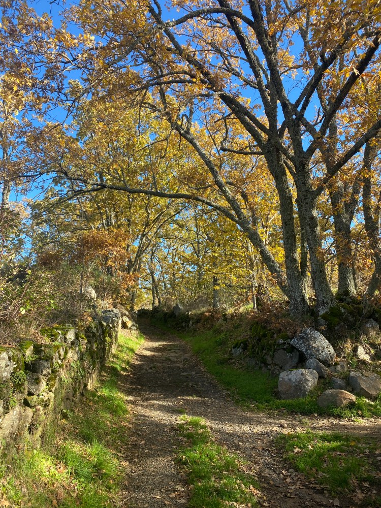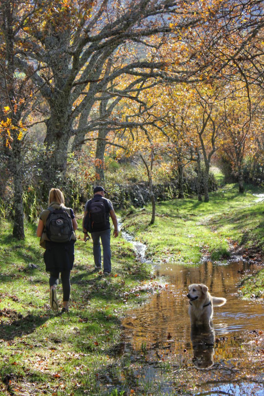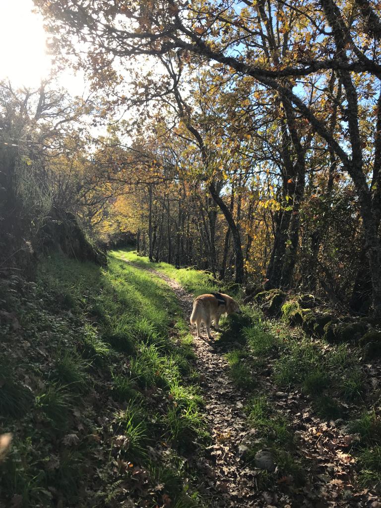 La vereda es muy sencilla y llana, rodeada de robles y castaños que nos acompañarán toda la ruta con vistas a la Sierra de Béjar. El suelo cubierto por las hojas contrasta con el verde del musgo que cubre los muros del camino, haciendo del recorrido un paseo mágico. Hay tramos en los que la vereda se estrecha, incluso está cubierta por un riachuelo (nacimiento del arroyo Gascón) producto de las últimas lluvias, lo que nos hace sortear el agua, excepto a Coquer, el golden que de nuevo nos acompaña en esta ruta- y que no duda en bañarse en cualquier charco, río o poza- junto a su amigo inseparable, Edu, con quienes compartimos la penúltima ruta por Hervás.