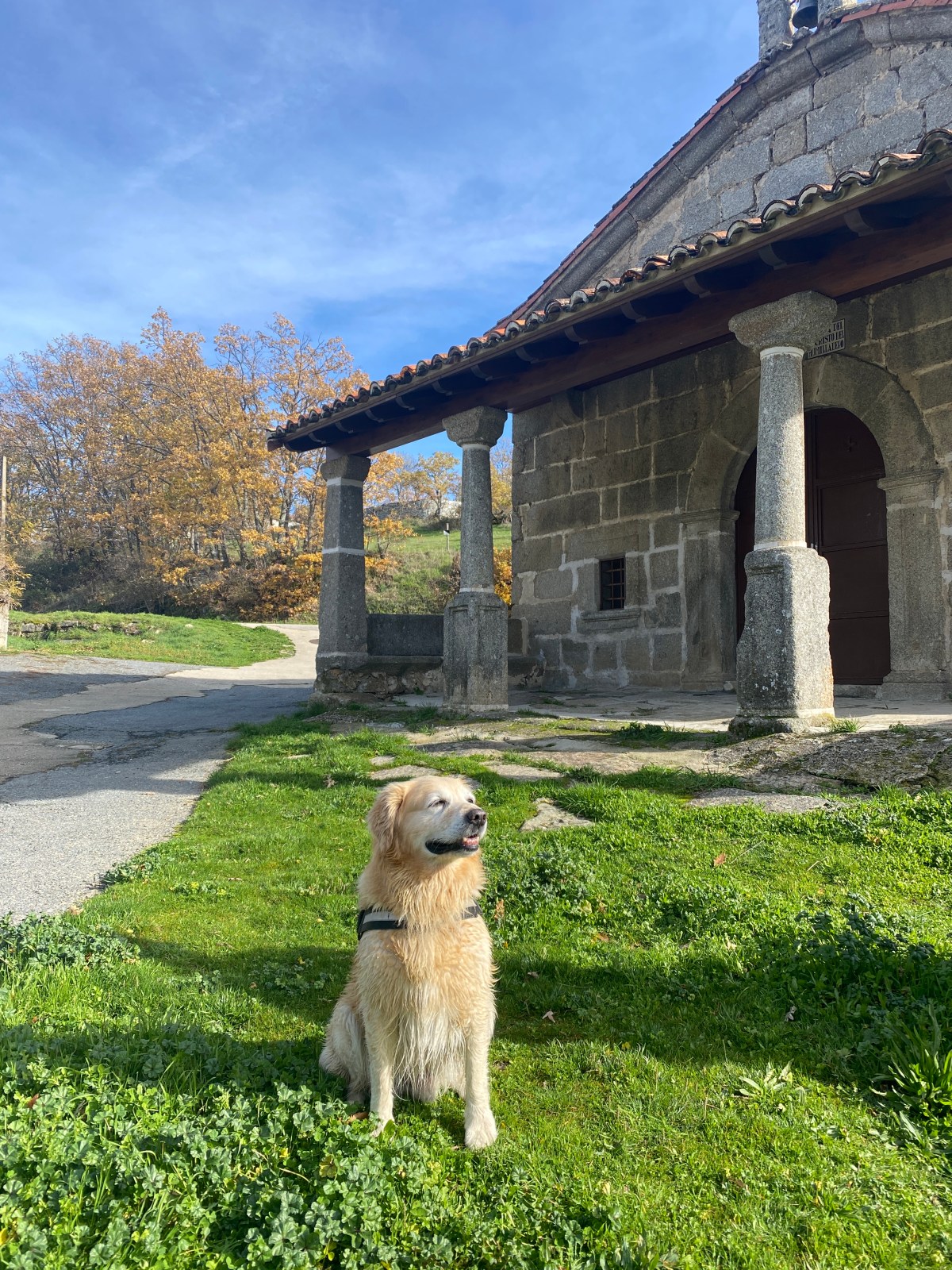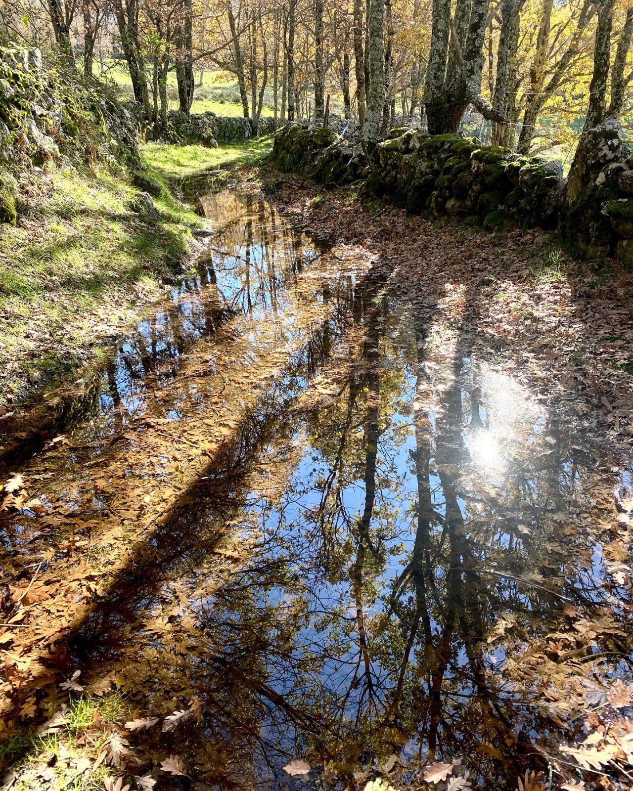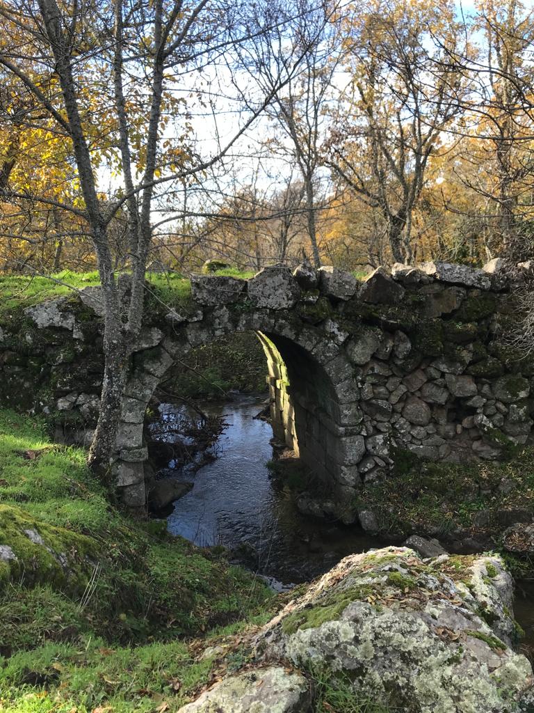 La vereda es muy sencilla y llana, rodeada de robles y castaños que nos acompañarán toda la ruta con vistas a la Sierra de Béjar. El suelo cubierto por las hojas contrasta con el verde del musgo que cubre los muros del camino, haciendo del recorrido un paseo mágico. Hay tramos en los que la vereda se estrecha, incluso está cubierta por un riachuelo (nacimiento del arroyo Gascón) producto de las últimas lluvias, lo que nos hace sortear el agua, excepto a Coquer, el golden que de nuevo nos acompaña en esta ruta- y que no duda en bañarse en cualquier charco, río o poza- junto a su amigo inseparable, Edu, con quienes compartimos la penúltima ruta por Hervás.