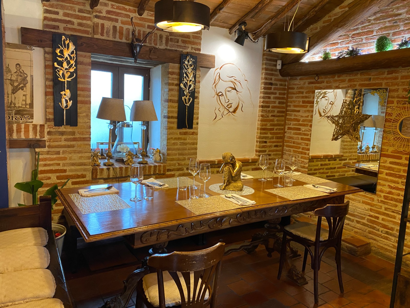 Finalizamos la ruta en el pueblo, concretamente en el restaurante Musicarte, donde nos esperan Raúl y Mario Carabias, dos hermanos que ya forman parte de la hostelería clásica de Salamanca después de haber regentado durante treinta años El Café Corrillo y el Musicarte en el centro de la ciudad, dos locales míticos de nuestra restauración. El entorno, el buen trato y la decoración forman parte de la idiosincrasia de estos hermanos además de priorizar los productos de temporada y las carnes a la brasa sin olvidar que, entre los meses de abril a octubre, cuentan con un cocinero italiano que elabora pizzas en el horno de leña. Pero su fuerte, me cuenta Mario, son las carnes, los pescados y los menús elaborados. Degustar esa variedad se hace más atractivo entre sus paredes, decoradas con mimo y cargadas de simbolismo.