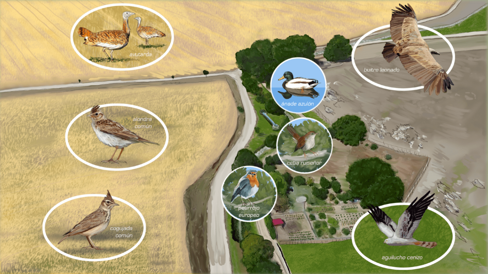 Para ir finalizando este paseo interpretativo, nos situamos frente a los pastos y campos de cultivo, a las afueras del pueblo. Junto al abrevadero, recientemente restaurado, todavía vemos el arroyo sobre el que vuelan algunas rapaces en busca de alimento. Incluso hay días en los que las avutardas se camuflan en los campos de trigo.