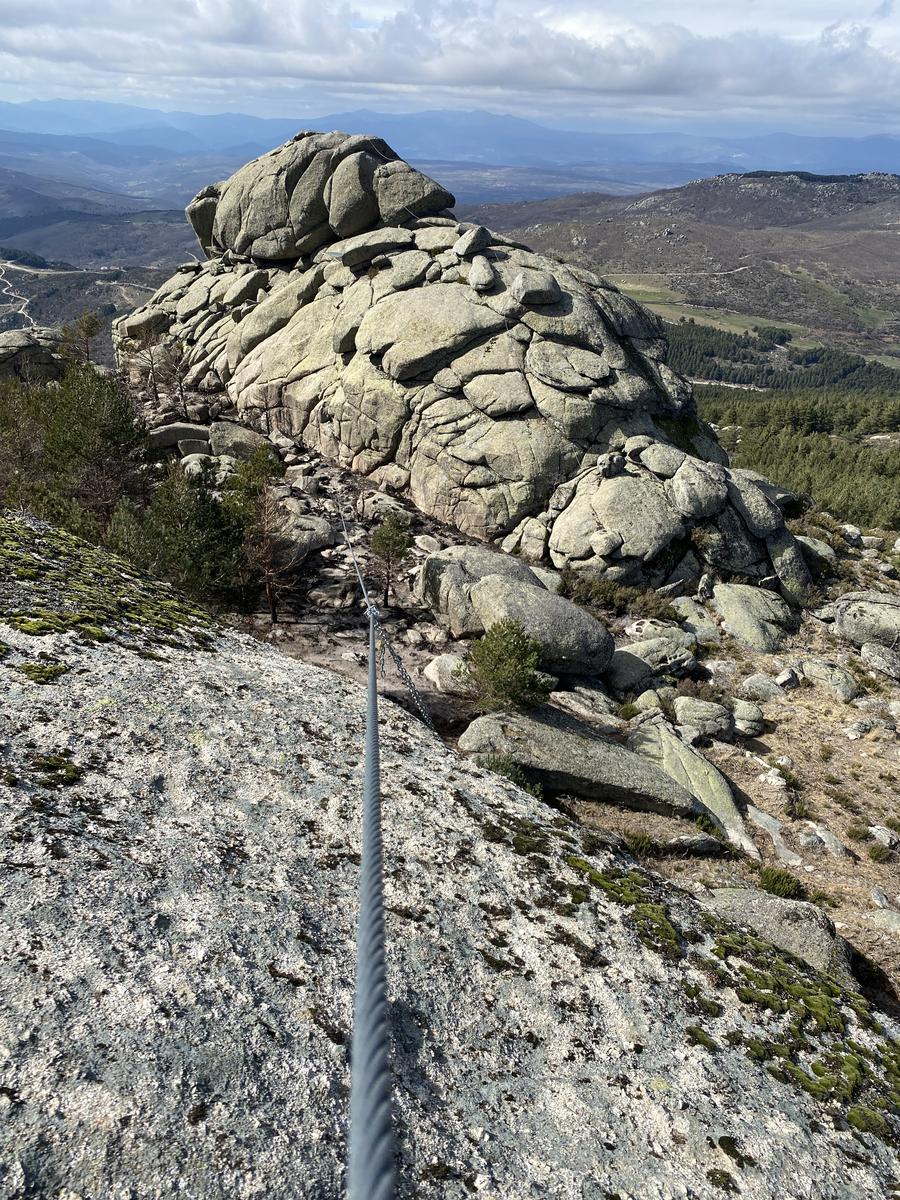 El lugar es conocido exactamente como el Cancho de La Muela, que hace alusión a una piedra muy grande. En este caso son dos grandes bloques que distan entre sí 50 metros, unidos por una tirolina que solo debe ser utilizada por gente con experiencia. Solo ver la verticalidad del cable en cuestión, impone. Recomiendo aprovechar los distintos huecos que hay en el granito a modo de sillones para recostarse y disfrutar del paisaje. Aunque pueda parecer lo contrario, son muy cómodos.