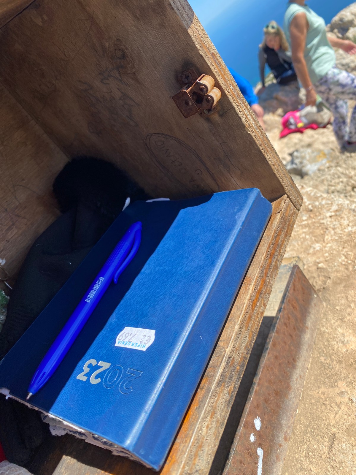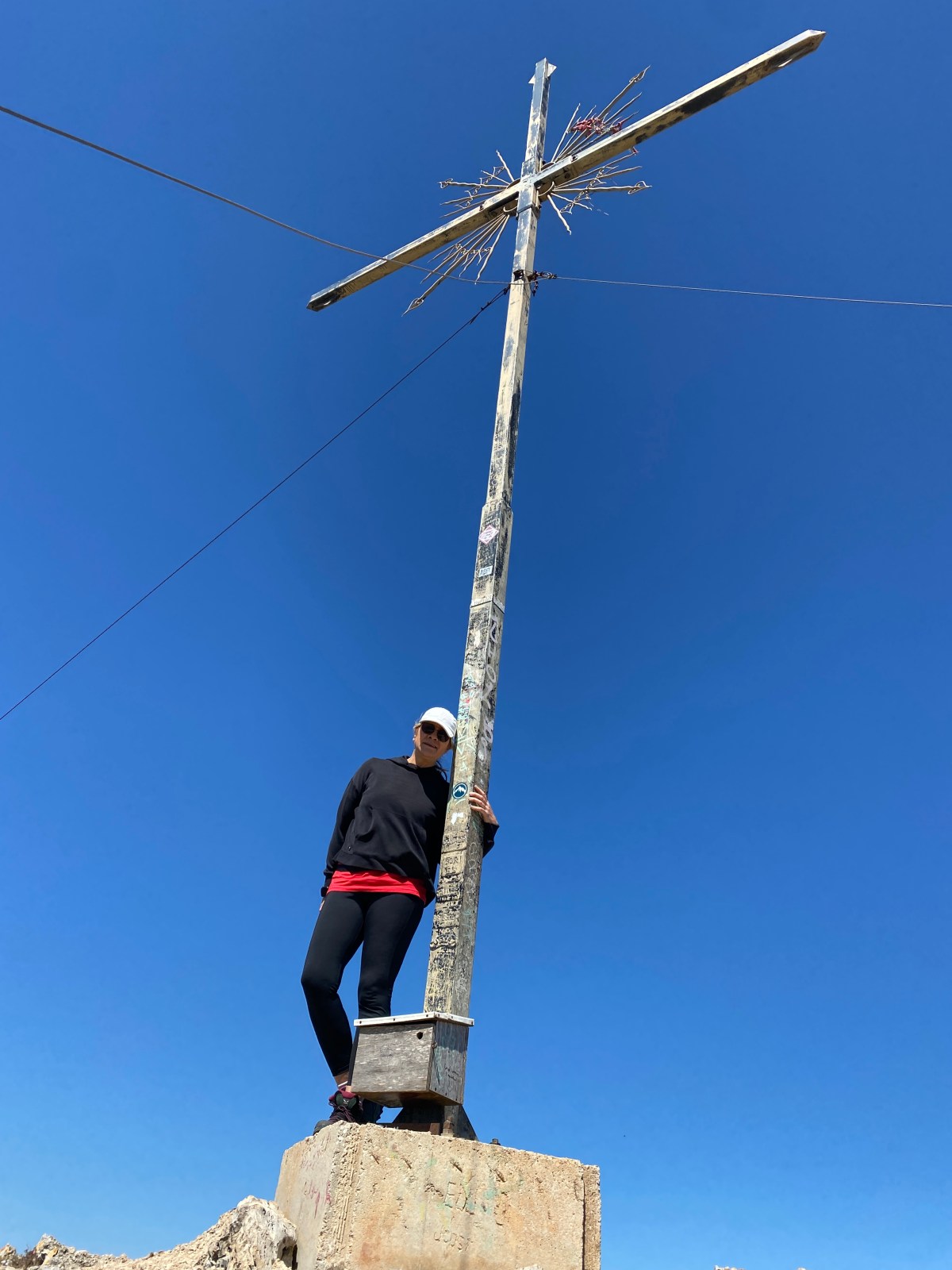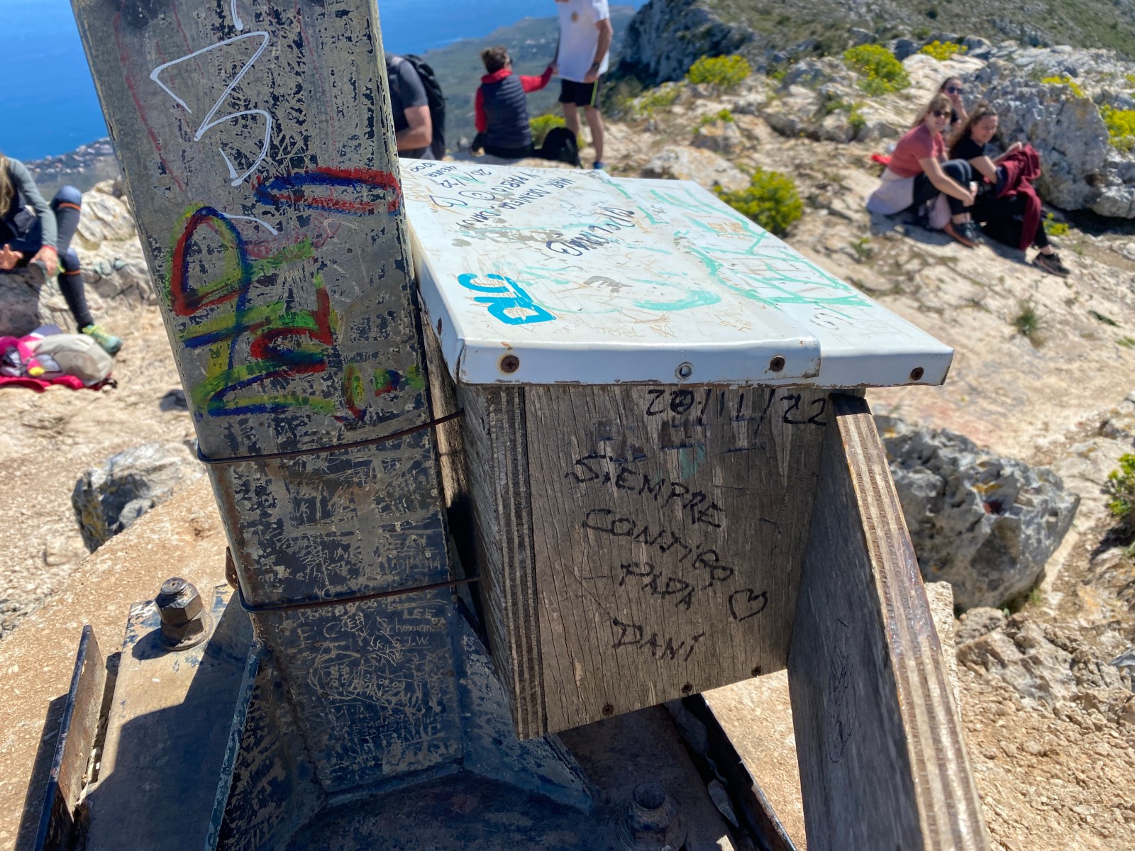 Este tramo hasta llegar a la Cruz se hace especialmente duro porque da la impresión de que el momento no llega nunca. Era Viernes Santo y la procesión os aseguro que estaba allí arriba. Decenas de personas subían y bajaban de la Creueta, lo que convirtió el momento foto en un acto de paciencia a tener en cuenta. Además de la foto, puedes dejar tu firma y una frase para la posteridad en un cuaderno que guardan dentro de una caja. Si alguien lee este post y sube a la Cruz, que le quite el precio a la libreta, por favor :))