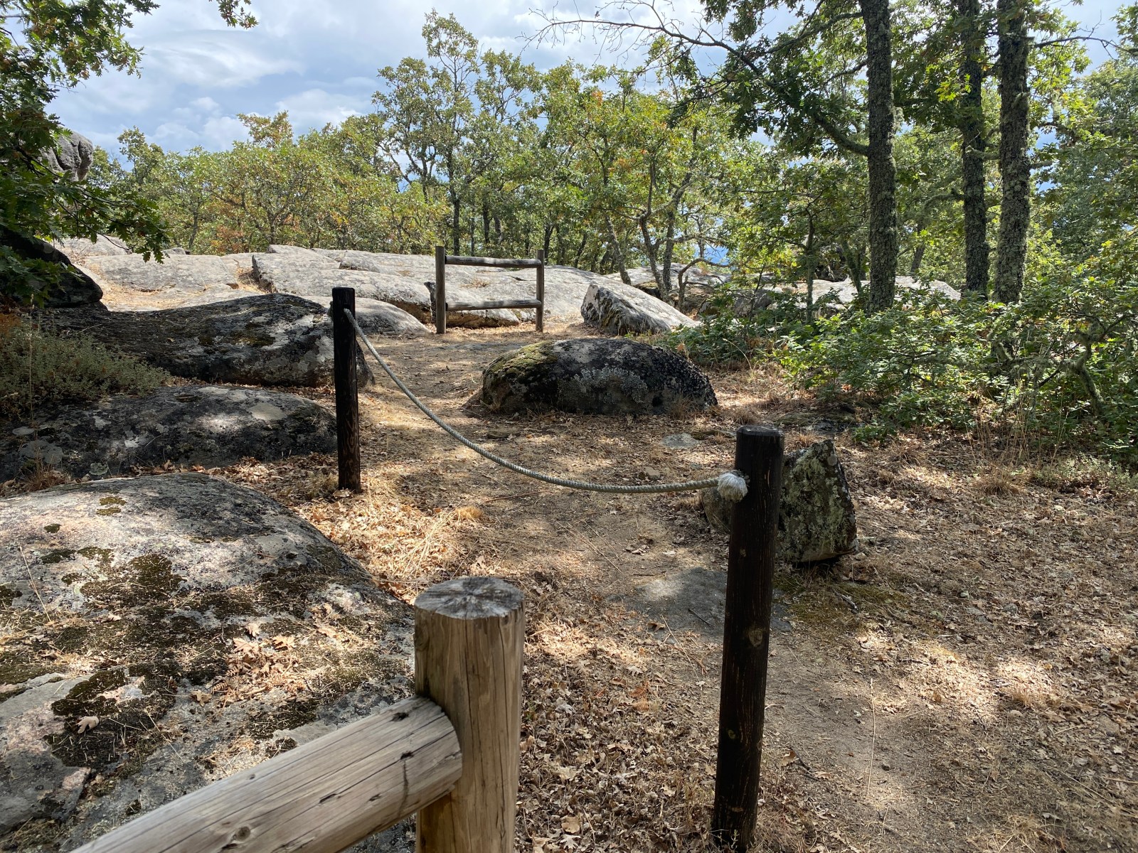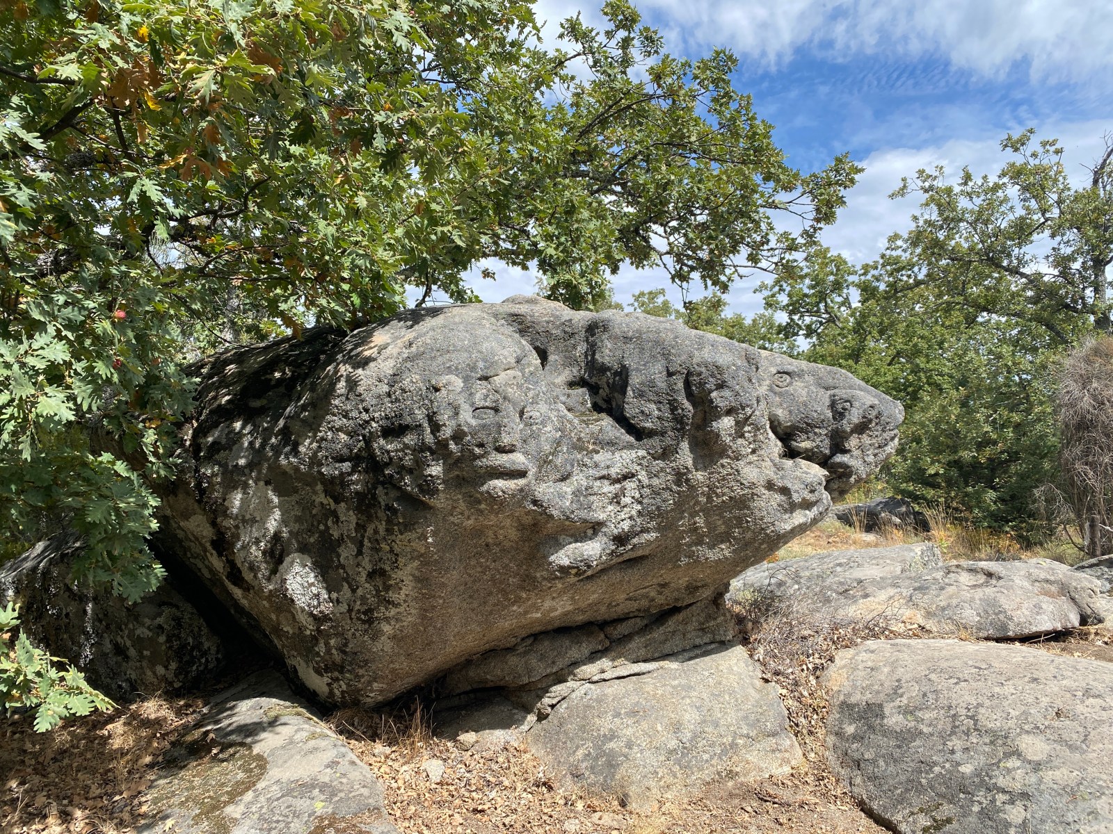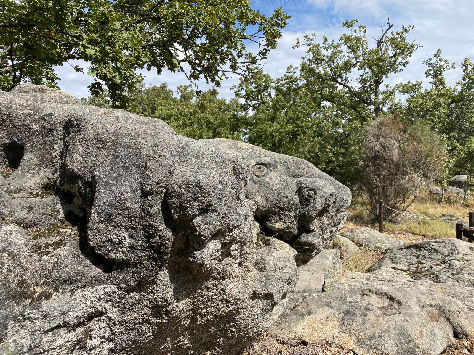 Más adelante vemos una bifurcación que nos indicará el camino hacia la Peña de Francia- para los que prefieran hacer esa ruta a pie- o continuar nuestro sendero con posibilidad de desviarnos un momento hacia el Camino de los Peñascos. Conviene señalar que esos 200 metros de desviación a la derecha ya nos son accesibles -hasta que volvamos a nuestro camino- y que nos llevarán hasta las Figuras de Tomé. Manuel Tomé es un escultor de la naturaleza que inició en 1995 un tallado sobre bloques de granito en los que ha ido esculpiendo rostros humanos o figuras de animales. Un lugar curioso que recomiendo visitar.